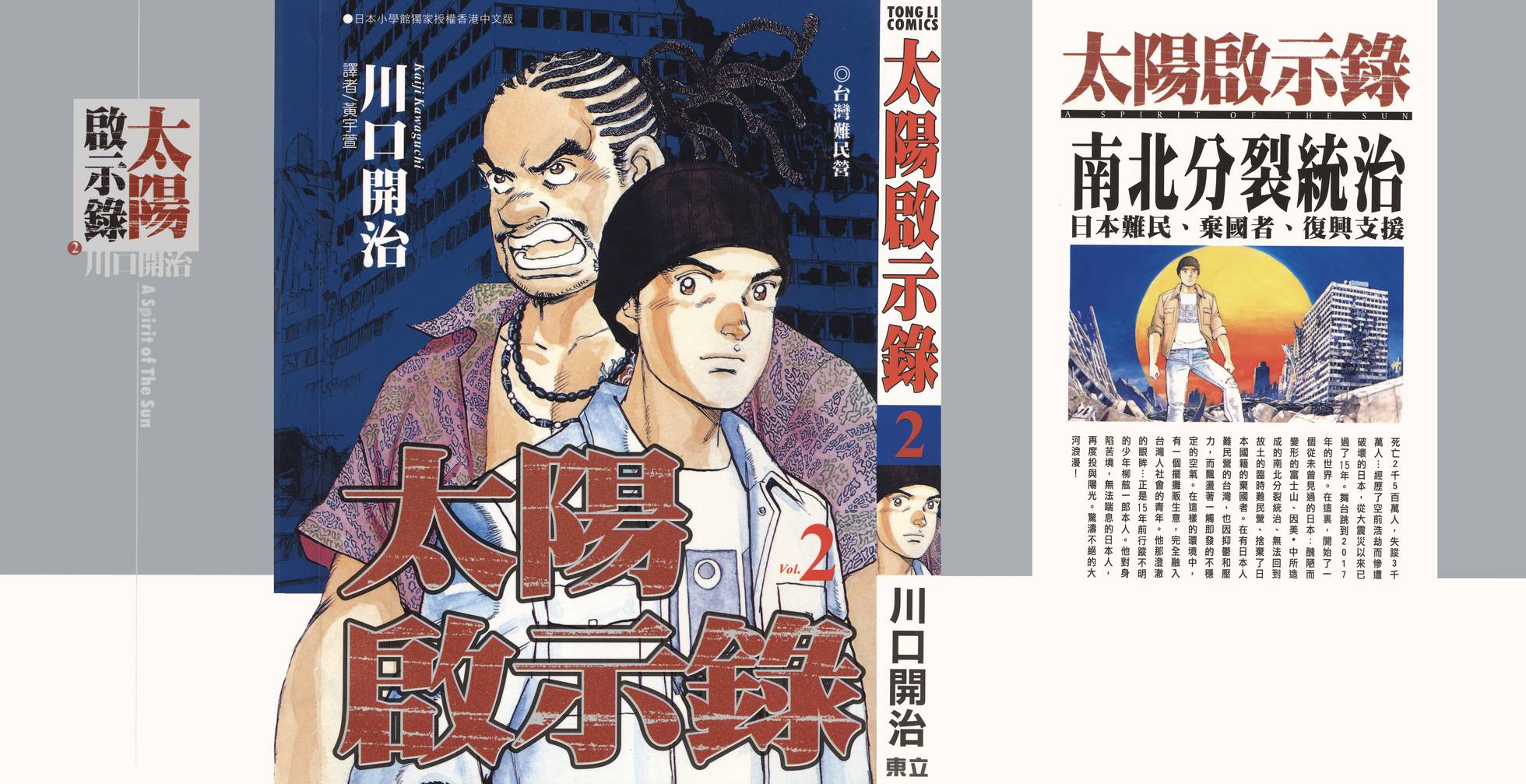 大地震、富士山爆发、首都溃灭一分為二的日本2002年8月10日是全日本国民永生难忘的日子。当天上午10点20分发生了芮氏规模8.8级的京滨大地震,影响所及使得富士山… 观看全部 大地震、富士山爆发、首都溃灭一分為二的日本2002年8月10日是全日本国民永生难忘的日子。当天上午10点20分发生了芮氏规模8.8级的京滨大地震,影响所及使得富士山开始爆发,巨大的地鸣和浓浓的黑烟改变了所有人的生活,繁华的日本顿时成為哀鸿遍野的人间炼狱。然而恶梦才刚开始,继京滨大地震之后,紧接著发生的东海、东南海以及南海大地震更将日本列岛分割成南北两大部分,这场空前的危机迫使日本政府不得不向世界各国求援,同时作成引进美中两国军队的协议。然而就在混乱当中,出现了一名相信未来的少年,他将会带领著日本国民从瓦砾堆当中站立起来,创造另一个现代救世主的传说!日本难民、弃国者、重建金援南北分裂统治距离造成2千5百万人死亡、3千万人下落不明的日本大地震转眼已经过了15个年头,故事的背景从2002年来到2017年的未来,呈现在眼前的是扭曲变形的日本,以及被削掉半个山头的富士山。由美国和中国一手主导的重建工作将日本分裂成北日本和南日本两大阵营,倖存的难民纷纷前往世界各国避难,捨弃原国籍归化他国的弃国者更是屡见不鲜,位于台湾淡水的日本难民营在历经多年来的不平等对待之后,也㳽漫著一股动乱的气氛。这时一位经营麵摊的青年出现了,有著一对明亮双眸的他正是15年前失去踪迹的日本少年柳舷一郎!这位有如太阳一般的救世主即将带领著日本难民走出苦难的生活!淡水难民营、武装恐怖份子、人肉盾牌8万人的呐喊世纪大地震之后过了15个年头,散居世界各地的日本难民至今仍无法迴归祖国,在所属的难民营过著次等公民的生活,位于台湾的淡水难民营也是其中之一。日益高涨的排日风潮让无辜的日籍母子死于非命,不甘就此屈服的少部份日本难民透过管道取得武器,集结成一股崇尚恐怖主义的武装集团。在大地震当中幸运存活下来的柳舷一郎得知排日风潮以及恐怖攻击都是由幕后的神秘组织一手策划出来的阴谋之后,决定挺身而出与恐怖份子展开谈判,以化解彼此之间的冲突与矛盾。舷一郎无私无我的牺牲精神感动了全体难民,為死气沉沉的难民营注入了一股全新的生命力!2002年的大地震造成政府机能的停摆,于是南北日本在美国以及中国的庇护之下,分别展开重建工作。经历大地震的年轻人宗方操受到南日本洛克威尔长官的赏识,前往哈佛大学攻读学位,10年之后学成归国,立刻被延揽入阁,担任南日本政府的要职,成為洛克威尔的左右手。然而打算将日本建立成一个全新国家的宗方操却与洛克威尔的野心相左,為了达成独立建国的梦想,他不惜以森村文件所记载的M资源為筹码,周旋在南日本与美国之间。革命、顺从抑或是中兴?日本的命运将何去何从?2002年的大地震夺走了宗方操的家人,对地震前的日本社会大為失望的他出任南日本政府的要职,决心打造全新的日本。就在这个时候,音讯全无的女友夏木惠理出现在他的面前,不过她现在的身分却是新兴宗教﹁既望会﹂的教祖十六夜。為了实现自己的野心,阿操只能将自己对惠理的思念深埋心底。另一方面,流落台湾的舷一郎在小张和羽田的陪伴之下,来到成為一片废墟的东京。舷一郎、阿操和惠理,这三人的命运将会激出灿烂的火花,抑或是永无止境的沉沦?海峡同盟的云井龙儿中止宗方操的暗杀计画,救了舷一郎一命。15年前的大地震发生的时候,住在北海道的他逃过一劫,旋即与父亲投入灾民的医疗工作。之后他与父亲前往本州,亲眼目睹北日本的惨状…另一方面,為了探究日本的愿景到底是统一抑或是分裂,舷一郎决定前往北海道与祖父柳拓磨见面,却在札幌遇见一个前所未有的野心家…!北日本军事政变.七星会.生离死别日本应该再度统一、抑或是分道扬镳?為了解开心中的疑惑,舷一郎冒险潜入北日本寻找祖父柳拓磨,却被北日本统治集团的首脑董藤卓也盯上。野心勃勃的董藤意图将北日本纳入掌中,同时也在暗中策动惊人的军事政变。遭到囚禁的舷一郎将何去何从?柳拓磨的命运又将如何?风云告急的北日本篇,即将迈入最后的高潮…!黑幕.海峡军事危机.决裂野心勃勃的董藤卓也拉拢了北日本自卫队的胜吕奉一,假借政变之名除掉了柳拓磨和马渊啟太郎,成為北日本第三任的首相。然而这不过是董藤自立為王的第一步棋罢了。另一方面,失去祖父的舷一郎强忍悲痛,与海峡同盟组成同一战线,誓言向董藤复仇。静观其变的宗方操也将阻挠南日本独立、主张南北统一的董藤视為头号大敌,南北日本的局势陷入空前的紧张,大战一触即发!北日本首相董藤卓也打著统一日本的旗号,肆无忌惮地扩张军备。南日本副主席宗方操為了实现独立的梦想,决定以暗杀的手段剷除敌人。另一方面,舷一郎和海峡同盟吸收董藤的秘书长,默默地等待反击的机会;然而一意孤行的董藤却以迅雷不及掩耳的速度派兵入侵海峡区,南北日本的内战一触即发…!野心实现?三日天下?重新出发南日本政府副主席宗方操承认北日本自卫队的驻防事实,同时对外发表声明,希望美方充当调停人的角色,商议南北双方的停战协定。这份声明等于是承认了董藤的胜利。可是宗方在内心却将董藤的存在视為南北和