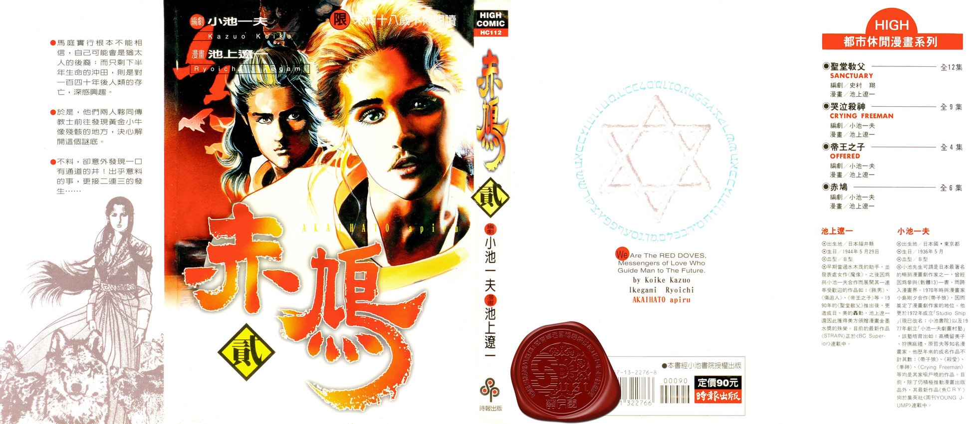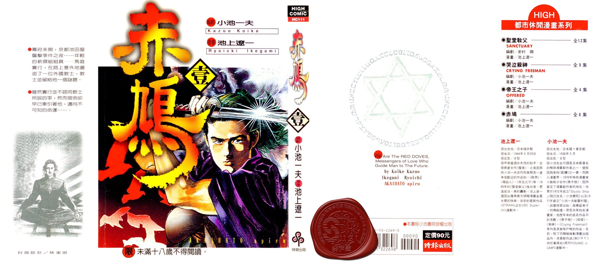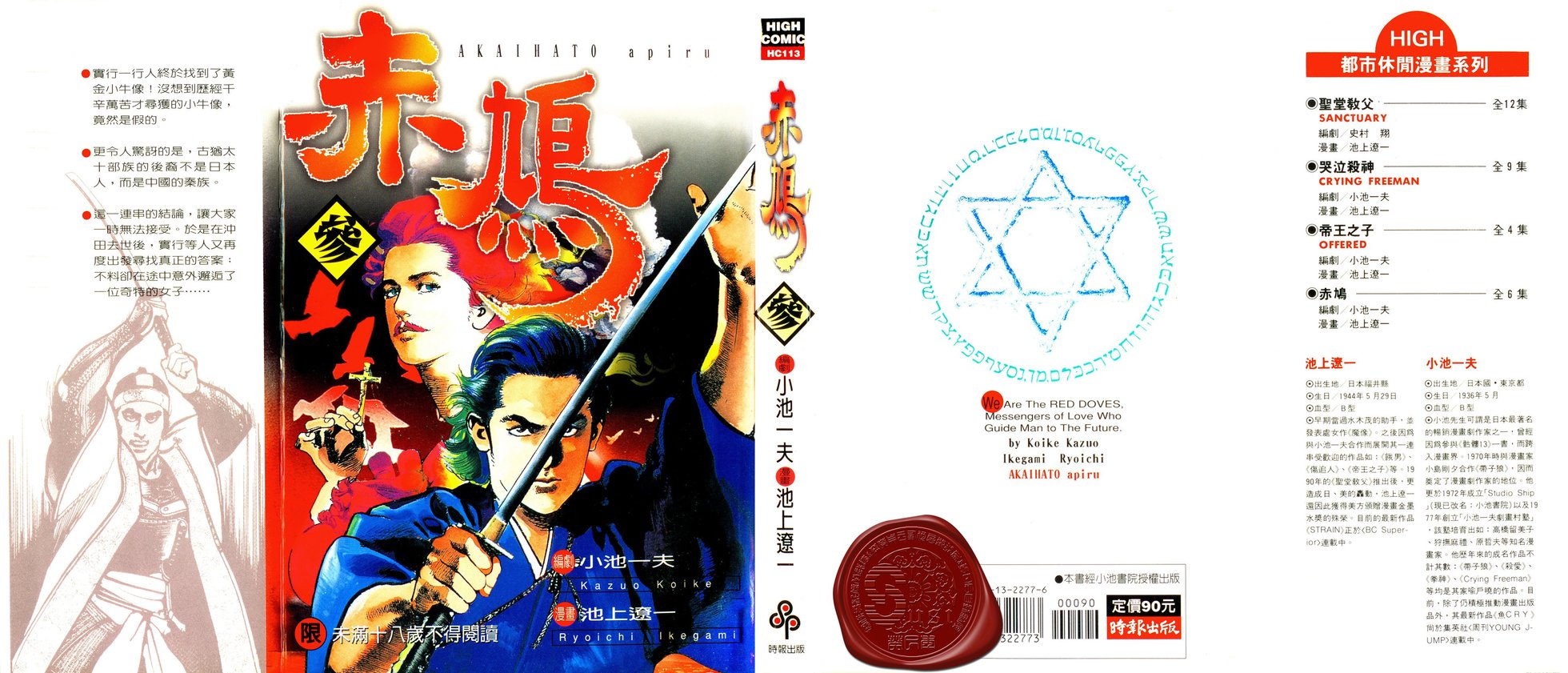 幕府未期,京都池田屋袭击事件之夜……年轻的新编组员马庭实行在路上遇到了外国教士,教士留给他一个谜题。虽然实行并不认同教士所说的话,然而宿命却早已牵引著他… 观看全部 幕府未期,京都池田屋袭击事件之夜……年轻的新编组员马庭实行在路上遇到了外国教士,教士留给他一个谜题。虽然实行并不认同教士所说的话,然而宿命却早已牵引著他,迈向不可知的未来。。而人类未来的存亡又与谜题有何关连?小池一夫与池上辽一又一完美力作!「赤鸠」向你报到!马庭实行根本不能相信自己可能是犹太人的后代!而只剩下半年生命的沖田,则是对一百四十年后人类的存亡有兴趣。于是他们三人前往发现金小牛像残骸的地方,决心解开这个谜底。然而,意料之外的事却发生了…;而那个刻满了汉字的大石碑,究竟隐含著什么秘密?实行一行人终于找到黄金小牛像了!没想到黄金小牛像竟然是假的,更令人惊讶的是,古犹太十部族的后代不是日本人,而是中国的秦族,这一连串的结论让大家一时不能接受,于是在沖田去世后,又出发去寻找真正的答案。高大的别式女生天目丰,竟然爱上了马庭实行!她甘冒生命危险救了实行一行人,更成為寻找十部族的得力伙伴。实行等人因為救了想推翻幕府的阪本龙马而成為眾人追杀的对象,重重危机中实行和阿丰更确定了彼此的感情。逃过幕府追杀的三人与阪本龙马道别后,继续寻找十部族的旅程。却在无意中住进黑店,并捲入帮派械斗当中!死亡商人强多拉為贩卖武器牺牲蜉蝣帮眾的性命,愤怒的实行等人改装后杀出重围、為了救出被交换武器的女人们进而潜入敌船。一行人在前往土佐的船旅并非风平浪静;被汙辱的女人们想自尽、阿丰怀孕、暴风雨中的实行和海本体会到自己正是「赤鸠」……。此时面前又出现海盗!波折不断的冒险何时才能结束?漫长的旅程终于要迎向终点,一行人幸运地漂流到土佐的海边,也见到了山内容堂。实行们急欲看见的日本书纪正是在山内容堂的手中,在两相比较之下,日本人是犹太人后裔的可能性越来越高,而南国之民的狙杀行动更确定了这个说法。奔向未来的赤鸠会结束他的冒险吗?波澜壮阔的钜作之完结篇!