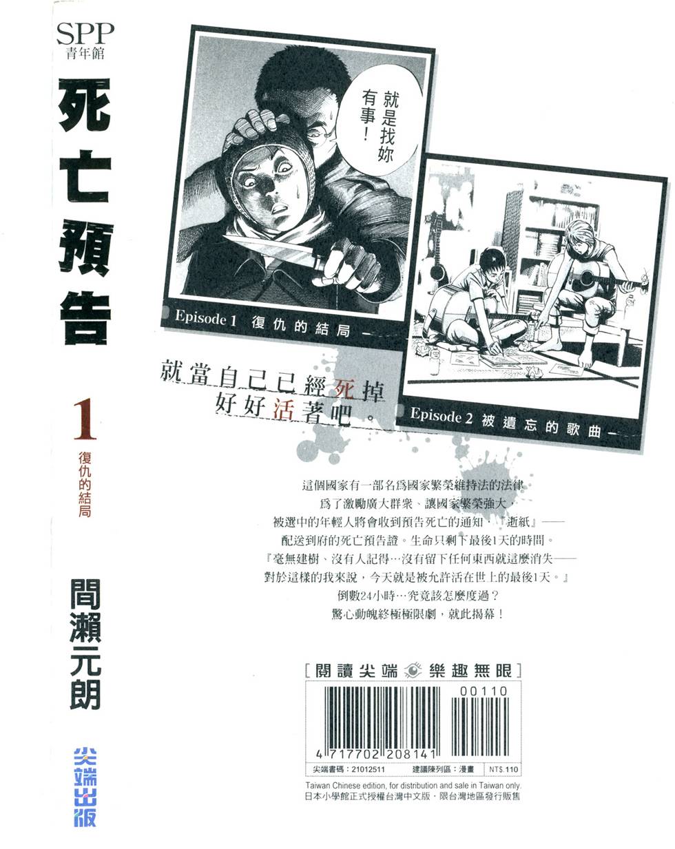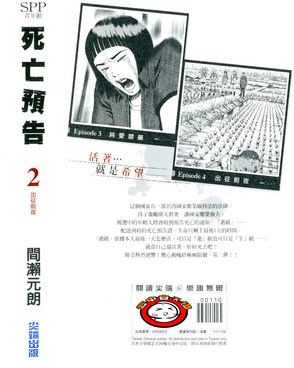 这个国家有一部名為国家繁荣维持法的法律。為了激励广大群眾、让国家繁荣强大,被选中的年轻人将会收到预告死亡的通知‧『逝纸』──配送到府的死亡预告证。生命只… 观看全部 这个国家有一部名為国家繁荣维持法的法律。為了激励广大群眾、让国家繁荣强大,被选中的年轻人将会收到预告死亡的通知‧『逝纸』──配送到府的死亡预告证。生命只剩下最后1天的时间。『毫无建树、没有人记得…没有留下任何东西就这么消失──对于这样的我来说,今天就是被允许活在世上的最后1天。』倒数24小时…究竟该怎么度过?惊心动魄终极极限剧,就此揭幕!这个国家有一部名為国家繁荣维持法的法律。為了激励广大群眾、让国家繁荣强大,被选中的年轻人将会收到预告死亡的通知‧『逝纸』──配送到府的死亡预告证。生命只剩下最后1天的时间。『逝纸,依据本人最后一天怎么活,可以是「逝」纸也可以是「生」纸──』就当自己还活著,好好死去吧?广受热烈迴响!惊心动魄终极极限剧,第二弹!!生既阴暗,死亦阴暗…所以一定要迸发出最后的光芒才行。这个国家有一部名為国家繁荣维持法的法律。為了激励广大群眾、让国家繁荣强大,被选中的年轻人将会收到预告死亡的通知‧『逝纸』──配送到府的死亡预告证。生命只剩下最后1天的时间。『如果没有逝纸,就无法认识生命的价值…我认為这样的社会本身就有很大的问题吧。』虽然就要从这个世界上消失──但是,究竟该做些什么,才能毫无牵挂地死去呢?激起广大回响!惊心动魄终极极限剧,第3弹!这个国家有一部名為国家繁荣维持法的法律。為了激励广大群眾、让国家繁荣强大,被选中的年轻人将会收到预告死亡的通知.『逝纸』──配送到府的死亡预告证。生命只剩下最后1天的时间。『我要烧了你们,让所有人明白我的愤怒。这不正是堂堂正正的国繁死吗?如果有意见,等去了地狱再说。』毫无道理才是人生──不要被迷惑,继续前进吧。激起广大回响!惊心动魄终极极限剧,第4弹!这个国家有一部名為国家繁荣维持法的法律。為了激励广大群眾、让国家繁荣强大,被选中的年轻人将会收到预告死亡的通知‧『逝纸』──配送到府的死亡预告证。生命只剩下最后1天的时间。『得到认可的墙──这道墙就由我来画吧。即将国繁死的天才涂鸦大师…只有我才有这个资格。因為我将面临得到认可的「死亡」──』大畅销!惊心动魄终极极限剧,第5弹!这个国家有一部名為国家繁荣维持法的法律。為了激励广大群眾、让国家繁荣强大,被选中的年轻人将会收到预告死亡的通知.『逝纸』──配送到府的死亡预告证。生命只剩下最后1天的时间。『手握大权的人居然对遭到国繁杀害的屈辱一无所知,这种事是可以原谅的吗……!?身為不断虐杀自己国民的这个体制的代表,我要让这些人亲眼看到真相!』激起广大回响!惊心动魄终极极限剧,第6弹!这个国家有一部名為国家繁荣维持法的法律。為了激励广大群眾、让国家繁荣强大,被选中的年轻人将会收到预告死亡的通知.『逝纸』──配送到府的死亡预告证。生命只剩下最后1天的时间。『还有人愿意相信我的可能性!没错!如果在这裡放弃,我的人生岂不成了一则笑话!即便遭到嘲笑、被当成傻瓜,我都要坚持到最后!来吧,克典──把自己的一切,直到最后一滴,都搾出来!』引起广大回响!惊心动魄终极极限剧,第7弹!这个国家有一部名為国家繁荣维持法的法律。為了激励广大群眾、让国家繁荣强大,被选中的年轻人将会收到预告死亡的通知.『逝纸』──配送到府的死亡预告证。生命只剩下最后1天的时间。『你们这些天生俊俏,以后也能继续当个型男活著的人…哪能瞭解我的悲哀!你们……最好全被国家宰杀掉!引发全国广大回响!惊心动魄终极极限剧,第8弹!这个国家有一部名為国家繁荣维持法的法律。為了激励广大群眾、让国家繁荣强大,被选中的年轻人将会收到预告死亡的通知.『逝纸』──配送到府的死亡预告证。生命只剩下最后1天的时间。『你知道个屁!这是命运…?这是荣耀…?我…我就是被他害死的啊…!』引发全国广大回响!惊心动魄终极极限剧,第9弹!这个国家有一部名為国家繁荣维持法的法律。為了激励广大群眾、让国家繁荣强大,被选中的年轻人将会收到预告死亡的通知.『逝纸』──配送到府的死亡预告证。生命只剩下最后1天的时间。『这种鬼地方,我一秒鐘都不想多待。甚至不想多呼吸一口空气。总之,我只想尽早…离开这个国家││』登上世界舞台的超人气作品!惊心动魄终极极限剧,在此完结!