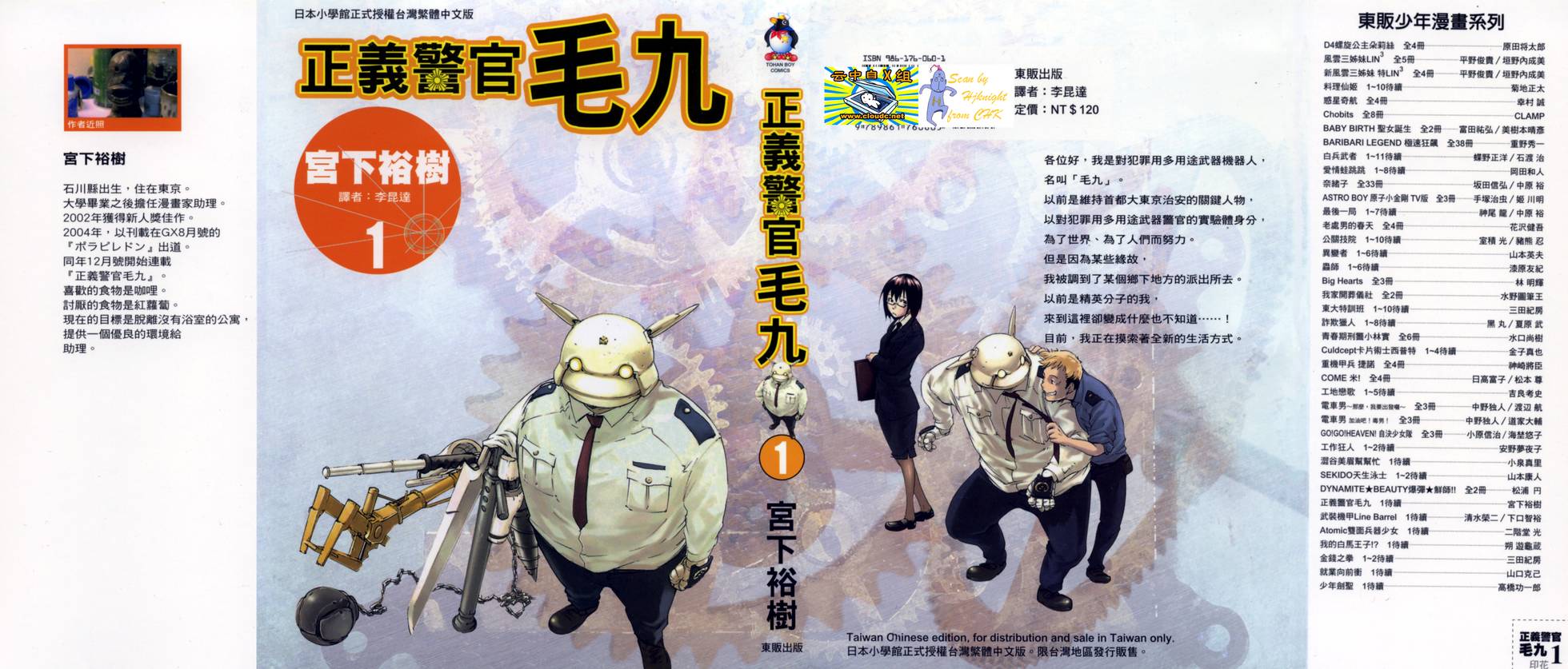 各位好,我是对犯罪用多用途武器机器人,名叫「毛九」。目前任职于乡下派出所。跟我可以说是兄弟机的普贤突然下落不明,让我心中有著非常不好的预感!就在这个时… 观看全部 各位好,我是对犯罪用多用途武器机器人,名叫「毛九」。目前任职于乡下派出所。跟我可以说是兄弟机的普贤突然下落不明,让我心中有著非常不好的预感!就在这个时候,普贤被三堀利用去打击罪犯,却因為新闻媒体拍摄到普贤过于残暴冷血的手段,连带使得我这个同一机型的机器人受到了排斥。為了阻止普贤杀更多的人,我也得采取行动了吗!?和我长得一模一样的红色机器人「普贤」,大家把他当成我的兄弟,受到了亲切的关照,但不知為何,却让我感到一股说不出的複杂情绪;其中不好的情绪占绝大部分。然而神谷小姐说:这就是嫉妒,强烈又麻烦的情感……!是真的吗?那我心中对他的危险感觉又是什么!?為了阻止普贤杀更多的人,我和山岸巡查深入敌营,但战斗表现却不如普贤。明明我俩的规格一样呀!?既然如此,那乾脆删除自己的心好了!而普贤一旦被逮捕了后,他的下场将是解体的命运!!虽然他对犯罪温床的东京黑街整顿一番,应该算是一大功劳……难道说绝对正义错了吗?普贤的事件暂告一段落后,日子又回覆以往的清闲。然而情人节的到来,却又让我笼罩在一团谜之中!我究竟是男是女!?而胯下长得很像那玩意的冷却水排水口,还有关怀山岸的心情是……恋爱吗?无法理解什么是恋爱的我,再加上白色情人节的大骚动,人类的世界要学习的地方真的是太多太多了!!这次,我跟著大伙来到京都参加日美机器人亲善交流会,却万万没想到会遭到恐怖攻击……!?美国研发出来的”处理超人”和我欲联手镇压这起事件,可是我们彼此之间对于恐怖分子的处理方式不同;像是人质问题等等,因而产生了对立。虽然很多事情还是不懂,但别小看了我心目中的「正义」!!看到企图自杀的女性,身為警官当然不能见死不救,不过,人们為什么要為了感情的事而想不开呢?这真的是令我感到烦恼得过热了!好在有个后辈到来,让我可以纾解热得过烫的脑袋。海基德帕斯是警卫机器,而我有了能互相仰慕的好同事,相信工作方面会很顺利才是;只要山岸巡查别扯后腿就行了对吧!?宿敌.三堀先生為了救出被绑架的心爱妹妹,竟向我和山岸巡查等人低头求助!由于犯人為前特武,地点又是犯罪的温床.东京贫民区,因此,一场名為「拯救三堀妹妹」的作战开始了!!另一方面,晚辈小6──海基德帕斯老是抢走我的锋头,如果想挽回自己的人气,就只能让他消逝在不能消逝的世界……!?再见了~毛九!!毛九以高杉一手创建的「凶恶犯罪扑灭课」的成员身分荣归东京。在高杉的指挥下,帮助三堀的部队扩展自己活跃的范围,但是……问题就发生在期望学习人性,永无止尽的追求活得更像人这些事的温柔之故!围绕著要采用毛九或是报废的争论白热化!毛九的命运将会如何呢?在最终争论进行的同时,毛九也赌上自己的命运展开行动!?别错过《正义警官毛九》第12集最终卷!!